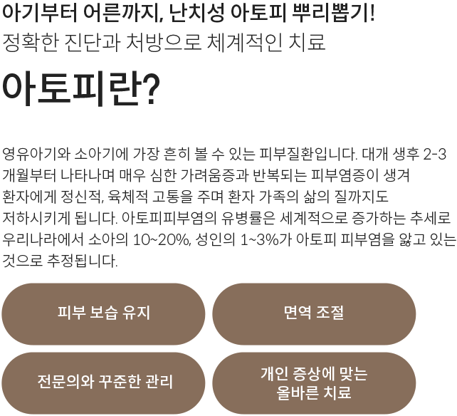 발병 특성과 체질에 따른 개별화된 치료로 피부과 전문의가 면역력개선과 피부증상을 함께 치료합니다.