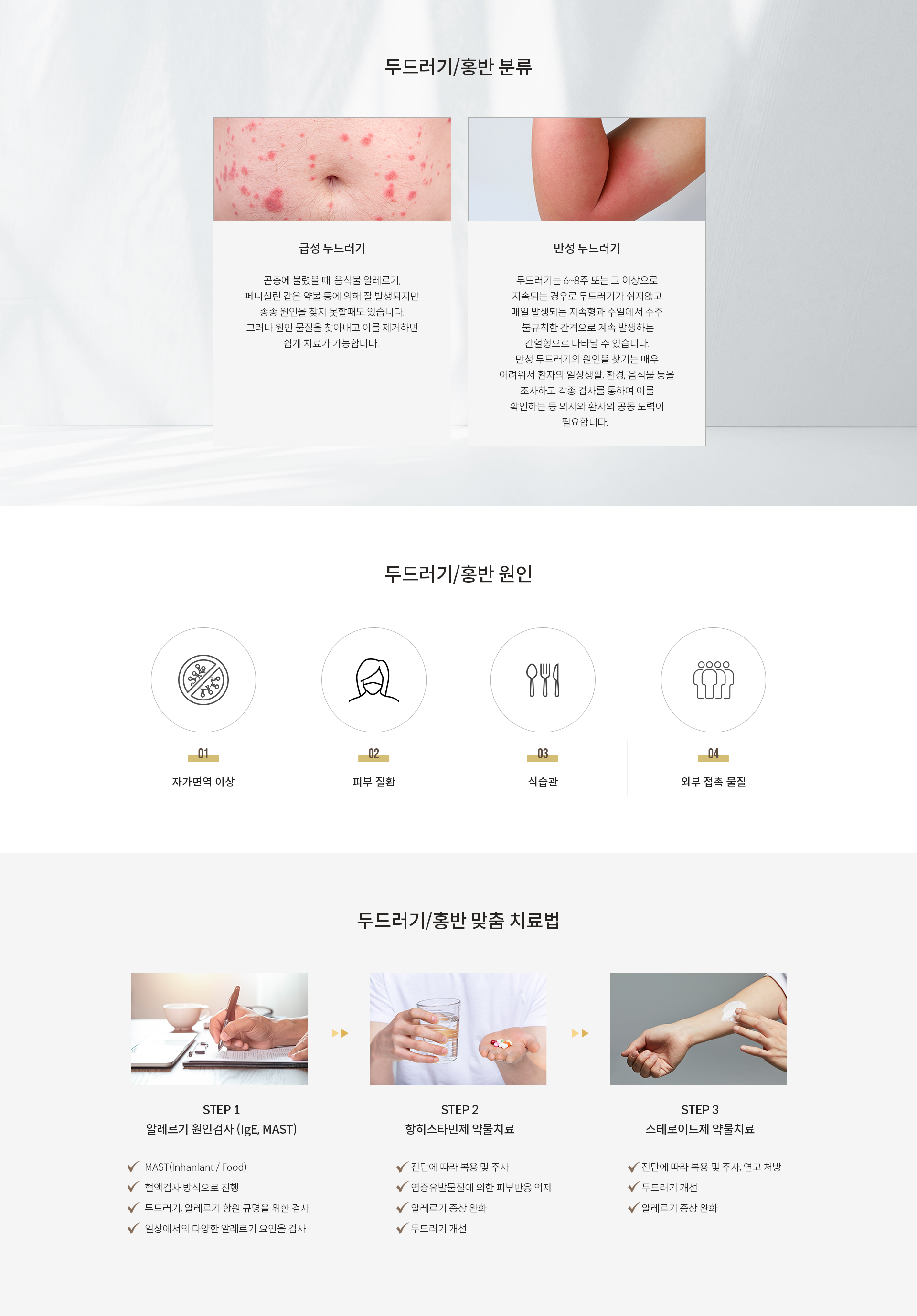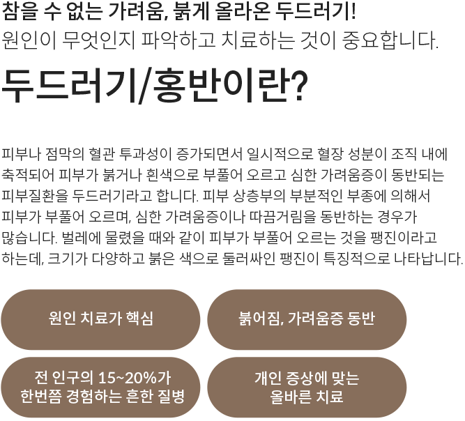 피부 또는 점막의 부종에 의해 부풀어 올라 창백한 홍반이 생기며 가려움증까지 동반하는 난치성 피부질환입니다. 만성 두드러기로 이어지지 않도록 환자의 체질과 병세를 분석하는 치료가 필요합니다.