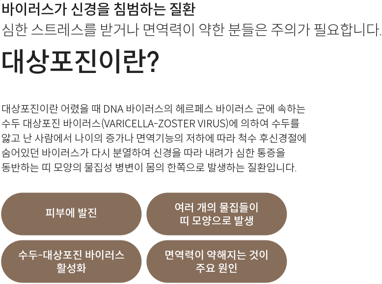 바이러스로 인해 나타나는 대상포진, 바이러스를 잠재우는 치료가 필요합니다.