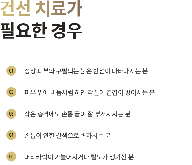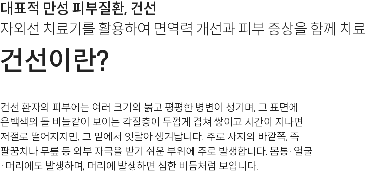건선은 비교적 재발을 자주하는 만성 피부 질환으로, 피부병이 생긴 위치나 정도가 개인에 따라 다르게 나타나는 원인을 알 수 없는 피부병입니다.