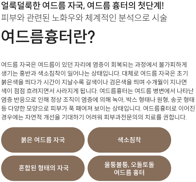 여드름이 났을 때 잘못 관리하면 얼굴에 보기 싫은 흉터가 남게 됩니다. 여드름은 염증이 심해지기 전에 올바른 치료법으로 관리를 잘하는 것이 흉터가 남는 것을 예방하는 방법입니다.